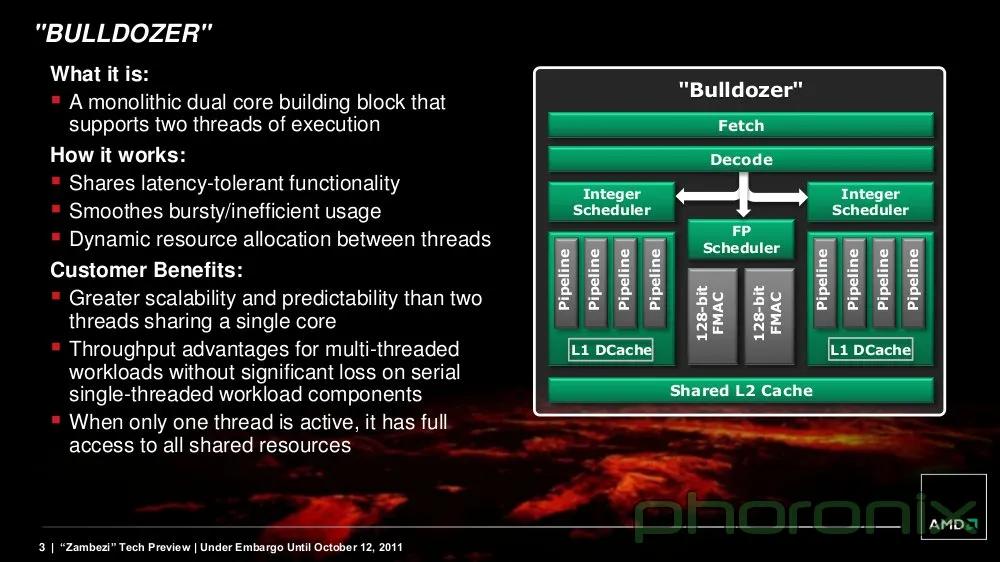 Each processor consists of several so-called modules. In addition to the cache and everything else that belongs to a typical processor core, a module contains two integer clusters, but only one floating point unit. The latter can either process one thread with 256-bit commands or two threads with 128-bit commands. Only one thread can run on the integer clusters at a time. All other units of the processor such as fetch and decode share all execution units. AMD calls this approach core multithreading. This method takes a similar approach to Simultaneous Multithreading , but goes one step further. While with simultaneous multithreading one essentially only doubles the registers in order to execute two threads on one core, with the Bulldozer architecture several integer clusters are built into one module.