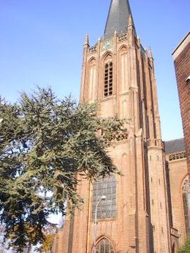The Exaltation of the Cross Church was built in 1891 and 1892 according to a design by Alfred Tepe . Based on the St. Nicholas basilica he had previously built in IJsselstein , he designed a three-aisled hall church with a tower, which in turn stands in the tradition of St. Lamberti in Münster. The equipment was donated by members of the St. Bernulphusgilde . The high altar in neo-Gothic style and two side altars were designed in the studio of Friedrich Wilhelm Mengelberg . The high altar is made of limestone with reliefs and pinnacles and has painted wooden wings . Five windows in the apse were glazed with lead . The cost of building the church, which was carried out on our own responsibility, was 148,284.84½ guilders.
