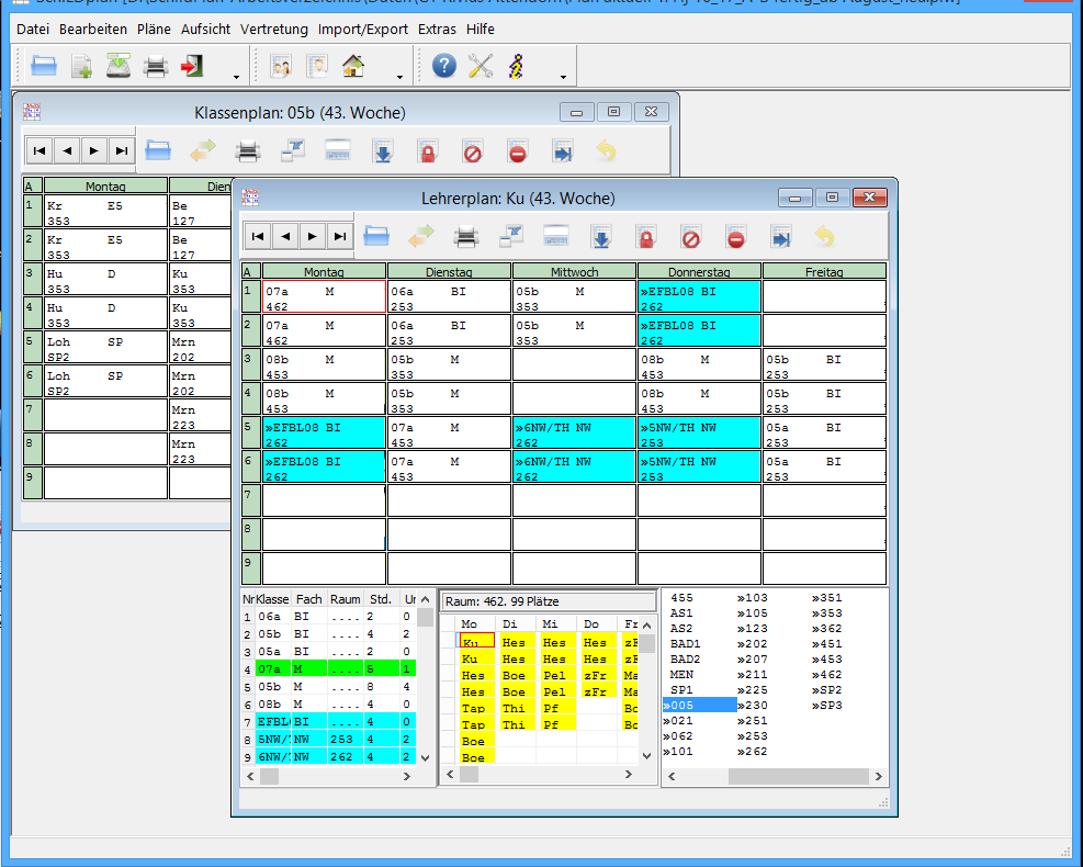 In WinPlan the procedure is reproduced that is known from the planning of the timetable on the pegboard. First you enter the lesson distribution, then the specifications for the plan, then the plan is calculated and then optimized. The lesson distribution as well as numerous plans and lists can be printed out. The program can also be used to create the daily substitution plan. All entries are checked for admissibility.
